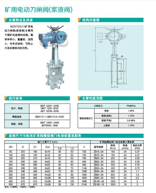 MZ973X(Y)礦用電動刀閘閥(漿液閥)主要用于煤礦的選煤和洗煤。整體體積小,重量輕、流阻小,對夾式結構、可防止介岳在閥體內的沉積。