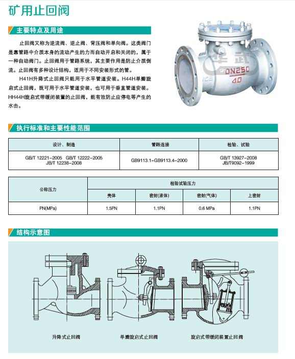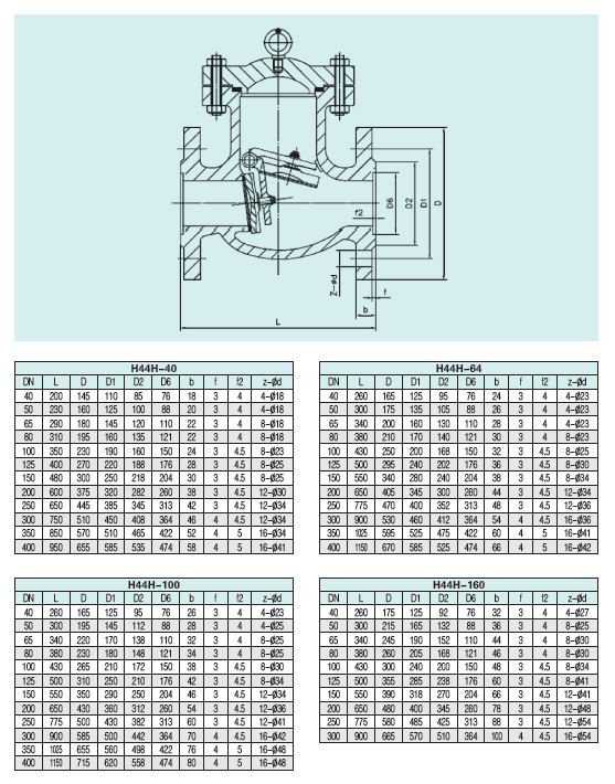 H41H升降式止回閥只能用于水平管道安裝。H44H單瓣旋啟式止回閥,既可用于水平管道安裝,也可用于垂直管道安裝。HH44H旋啟式帶緩閉裝置的止回閥,能有效防止應停電等產生的水擊。