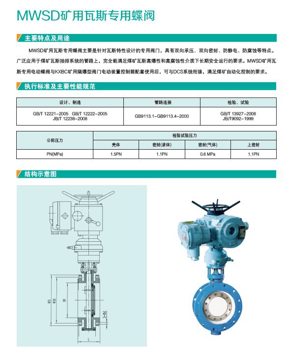 MWSD礦用瓦斯專用蝶閥主要是針對瓦斯特性設(shè)計的專用閥門。具有雙向承壓、雙向密封、防靜電、防腐蝕等特點。廣泛應(yīng)用于煤礦瓦斯抽排系統(tǒng)的管路上,完全能滿足煤礦瓦斯高爆性和高腐蝕性介質(zhì)下長期安全運行的要求。MWSD礦用瓦斯專用電動蝶閥與KXBC礦用隔爆型電動控制箱配套使用后,可與DCS系統(tǒng)銜接,滿足煤礦自動化控制的要求。